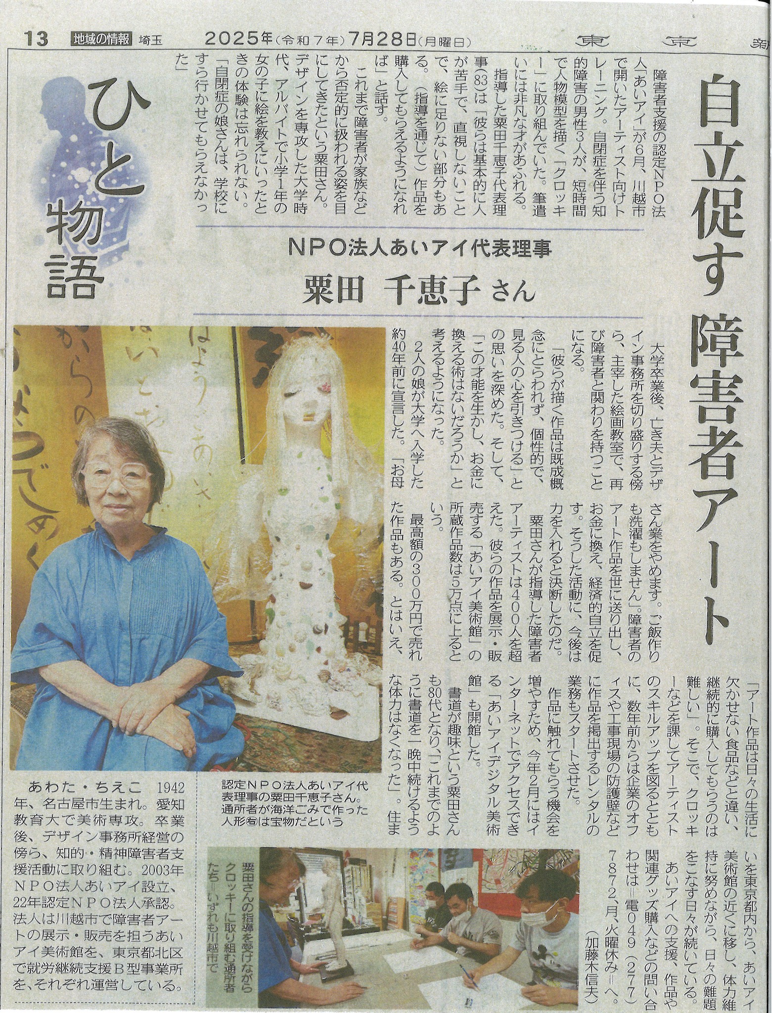 東京新聞にあいアイ代表理事「粟田千恵子」インタビュー記事が掲載されました 東京新聞にあいアイ代表理事「粟田千恵子」インタビュー記事が掲載されました 2025.07.30 メディア あいアイ代表理事「粟田千恵子」インタビュー記事が7月28日の東京新聞に掲載されました。