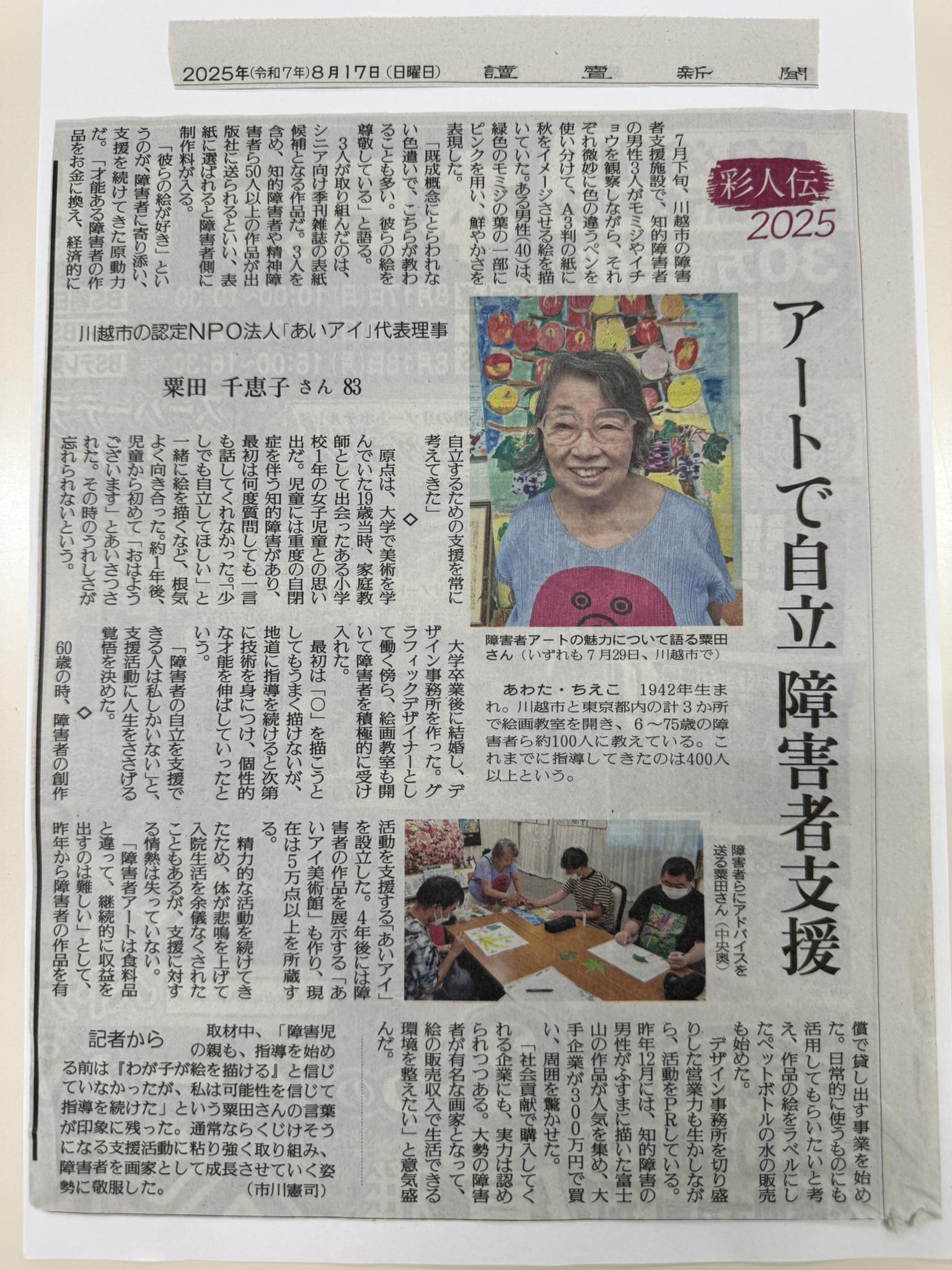 読売新聞にあいアイ代表理事「粟田千恵子」インタビュー記事が掲載されました 読売新聞にあいアイ代表理事「粟田千恵子」インタビュー記事が掲載されました 2025.08.19 メディア あいアイ代表理事「粟田千恵子」インタビュー記事が8月17日の読売新聞に掲載されました。